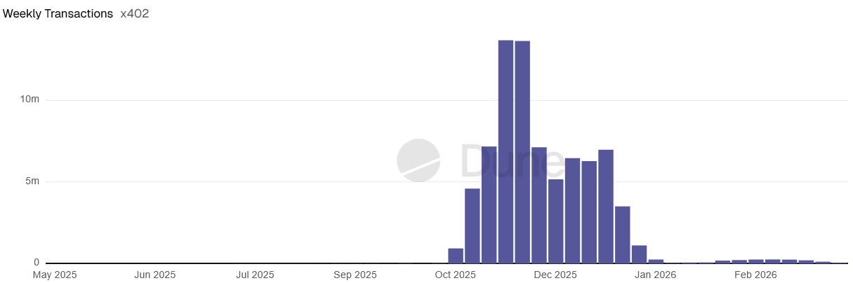 Transaction activity for the x402 protocol peaked in November last year but quieted down in 2026, Dune Analytics data shows.