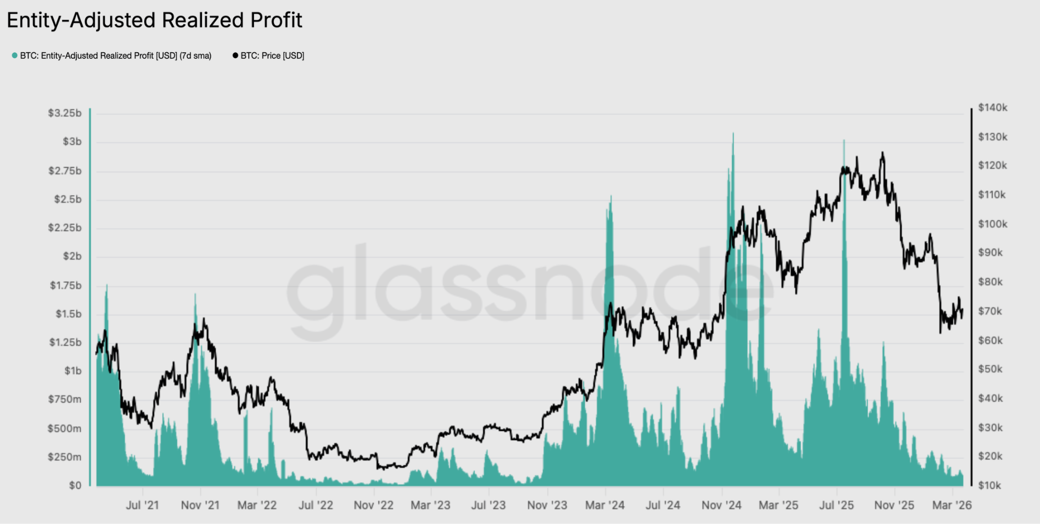 Bitcoin’s entity-adjusted realized profit has also dropped from a peak of $3 billion per day in July 2025 to below $0.1 billion today.