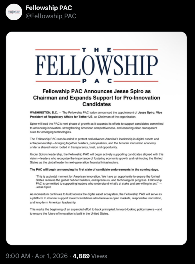 Jesse Spiro, the head of government affairs at stablecoin issuer Tether, will be chairing the organization of a crypto-backed Super political action committee (PAC) to “actively support candidates” in the 2026 US midterm elections and beyond.