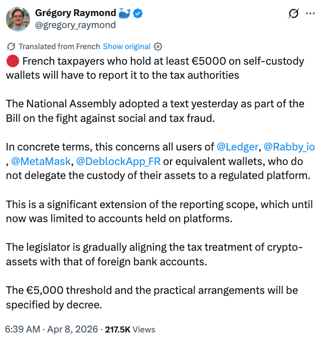 In a separate move, France’s National Assembly adopted on April 7 a provision in an anti-fraud bill that would require annual reporting of self-hosted crypto wallets above a 5,000 euro threshold, according to Gregory Raymond, founder of local outlet The Big Whale.