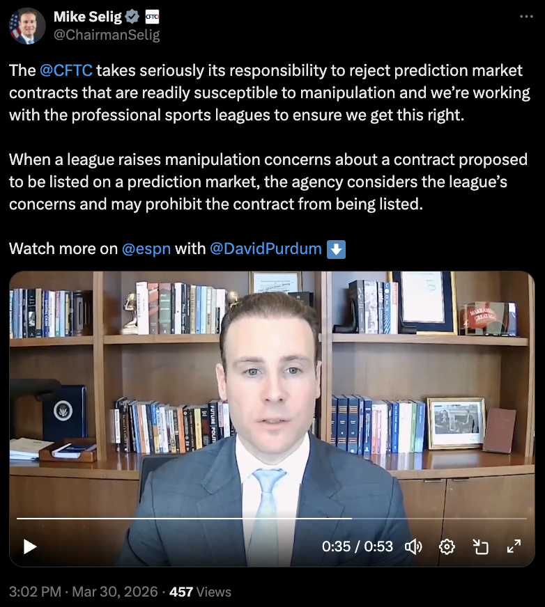 “When a league raises manipulation concerns about a contract proposed to be listed on a prediction market, the agency considers the league’s concerns and may prohibit the contract from being listed,” said CFTC Chair Michael Selig in a Monday interview with ESPN posted to X, adding: